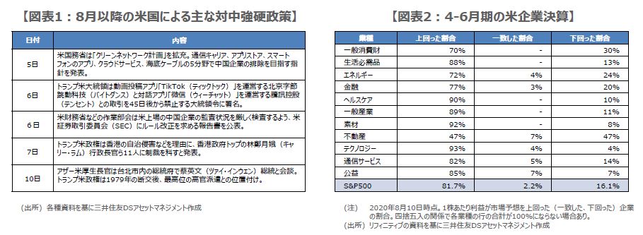 トランプ米政権は8月に入り、対中強硬姿勢を一段と強めています(図表1)。米国務省は5日、個人や企業の情報を保護するため、通信キャリアやアプリストアなどの5分野から中国企業の排除を目指す、新たな指針を発表しました。そして、トランプ米大統領は翌6日、動画投稿アプリ「TikTok(ティックトック)」と対話アプリ「微信(ウィーチャット)」を運営する中国の2企業との取引を、45日後から禁止する大統領令に署名しました。