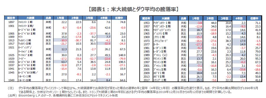図表1は、マッキンリー大統領Ⅰ期からトランプ大統領Ⅰ期までについて、任期中の各年(1年目は大統領選挙の翌年、2年目は中間選挙、3年目は大統領選挙の前年、4年目は大統領選挙の年)および任期4年通年のダウ工業株30種平均の騰落率を示したものです。なお、トランプ大統領Ⅰ期の4年目は2020年ですので、ダウ平均の騰落率は2019年12月31日から8月12日までの期間で計算しています。