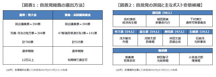総裁選は通常、3年の任期満了時に実施され、国会議員票と、それと同数の党員・党友による地方票の合計数で選ばれます(図表1)。しかしながら、今回のように総裁が任期中に辞任するなど緊急の場合は、党員・党友投票を省いた両院議員総会で選出することができます。二階氏は28日の記者会見で、時間にゆとりがあれば党員・党友投票は考えるべきだが、党内の意見を聞いて判断したいと述べ、両院議員総会による選出を示唆しました。
