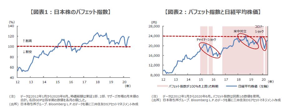日本株の時価総額を日本の名目GDPで割ったバフェット指数は約120%となり、日本株は割高