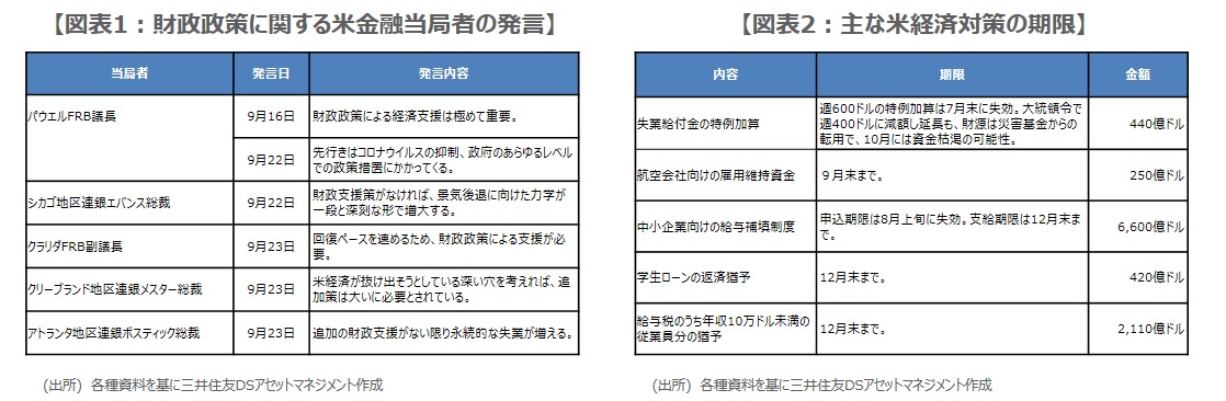 米国では、経済対策第4弾を巡る与野党の財政協議が難航しており、同対策の早期実現が見通しにくくなっています。このところ、米連邦準備制度理事会(FRB)のパウエル議長やクラリダ副議長など、多くの米金融当局者が、財政政策による経済支援の重要性を指摘していることから(図表1)、市場では財政協議の難航を不安視する向きも増えつつあり、足元の米株安の一因となっています。