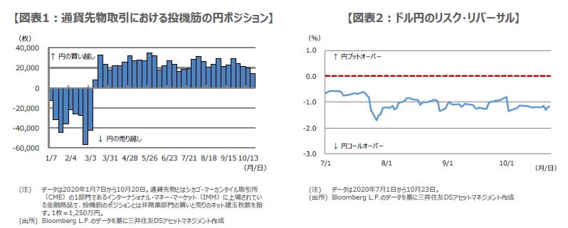 はじめに、通貨先物の投機筋ポジションを確認します。図表1の通り、円ポジションは年初、売り越し基調でしたが、春先のコロナ・ショックにより、一気に買い越しに転じました。その後は、買い越し基調が続き、直近の10月20日時点では、やや買い越し額が減少しています。つまり、現状のポジションに大きな偏りがないため、投機筋は更なる円買いにも、一転して円売りにも、動きやすい状況にあることが分かります。