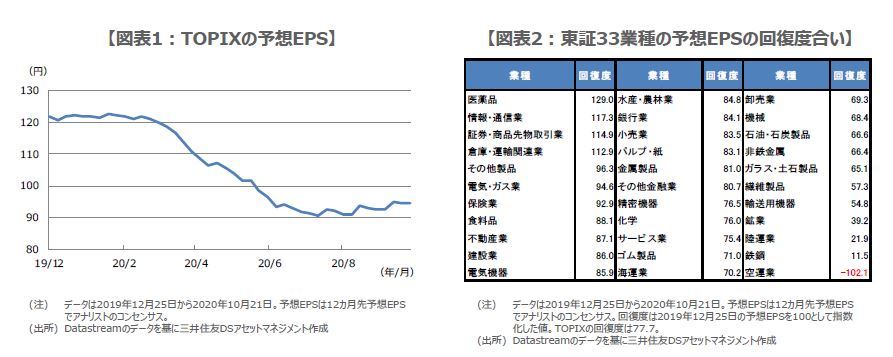 東証株価指数(TOPIX)の予想EPSは図表1の通りです。年初からしばらくは底堅い動きが続いていましたが、新型コロナウイルスの感染が世界的に拡大したことを受け、春先以降は大きく低下しています。ただ、夏場には下げ止まり、その後は足元まで緩やかに持ち直しており、底入れしつつあるように見受けられます。それでもまだ、回復に力強さはありません。