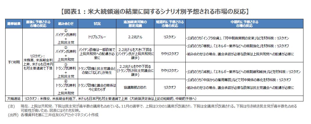 図表1において、バイデン氏勝利で組み合わせ①の場合、追加経済対策については、民主党案である2.2兆ドル規模への期待が高まり、市場のリスクオン(選好)の度合いは相対的に大きくなると思われます。ただ、組み合わせ②の場合、共和党が上院で多数議席を占めるため、追加経済対策の規模は2.2兆ドルを大きく下回り、市場はややリスクオフ(回避)に傾くことが考えられます。