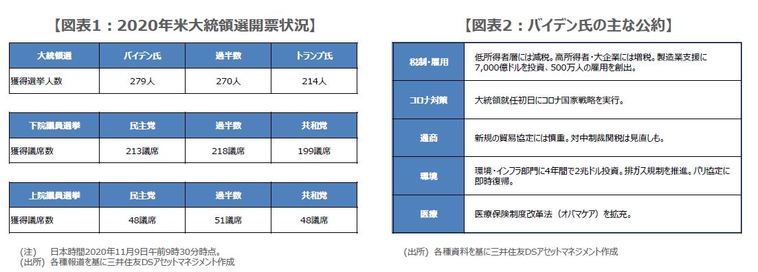 上院選については、恐らく共和党が過半数議席を占め、弊社では「バイデン大統領+上院共和党+下院民主党」となる公算が大きいと考えています。この場合、バイデン氏の公約(図表2)実現には、一定程度、上院共和党への配慮が必要になります。具体的には増税を財源とするインフラ投資の規模が縮小することなどが想定されますが、株式市場は今のところこれらの点は材料視していないように見受けられます。