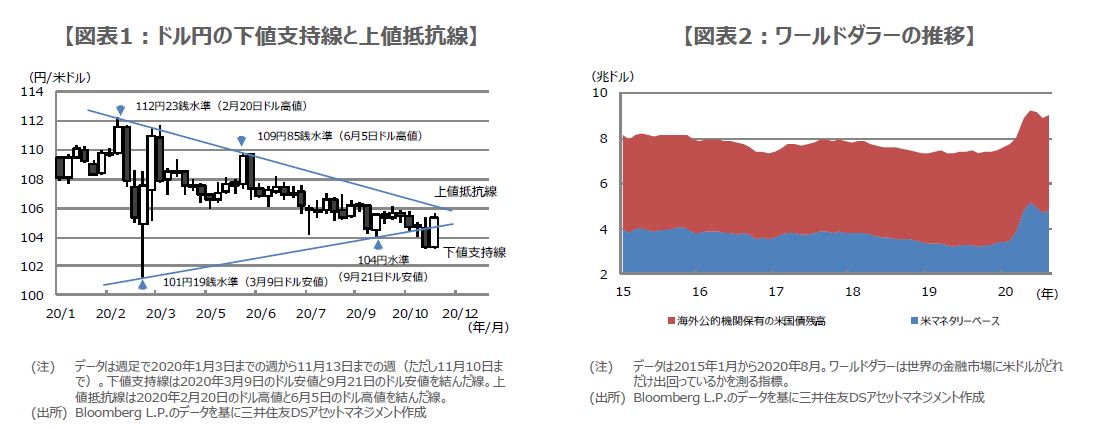 弊社では、米10年国債利回りについて、2020年12月末は0.9%程度、2021年3月末は1.0%程度を予想しており、これらがある程度、ドル円のドル高・円安方向の支えになるとみています。なお、ドル円は現在、「三角保ち合い(さんかくもちあい)」を形成していますが、先週は下値支持線をいったん下抜け、今週は戻っています(図表1)。仮に今月、105円台で取引を終えれば、三角保ち合いは失効し、当面横ばい推移が示唆されます。