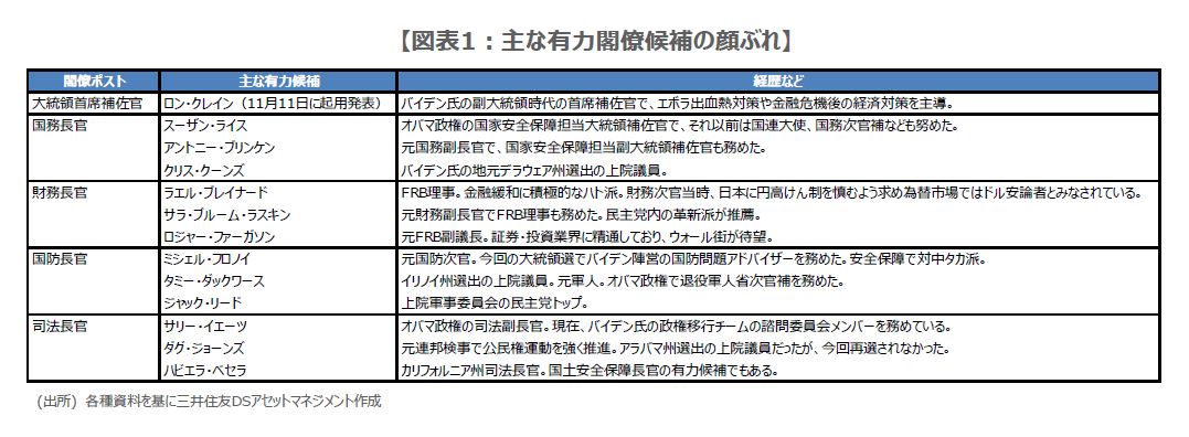 市場では、米大統領選で当選を確実にしたバイデン氏の閣僚人事に注目が集まっています。そこで今回のレポートでは、有力閣僚候補の顔ぶれを紹介します(図表1)。まず、ホワイトハウスを取り仕切る「大統領首席補佐官」は、すでにロン・クレイン氏の起用が11月11日に発表されました。同氏はバイデン氏の副大統領時代の首席補佐官で、エボラ出血熱対策や金融危機後の経済対策を主導しており、コロナ対策を念頭に置いた人事とみられます。