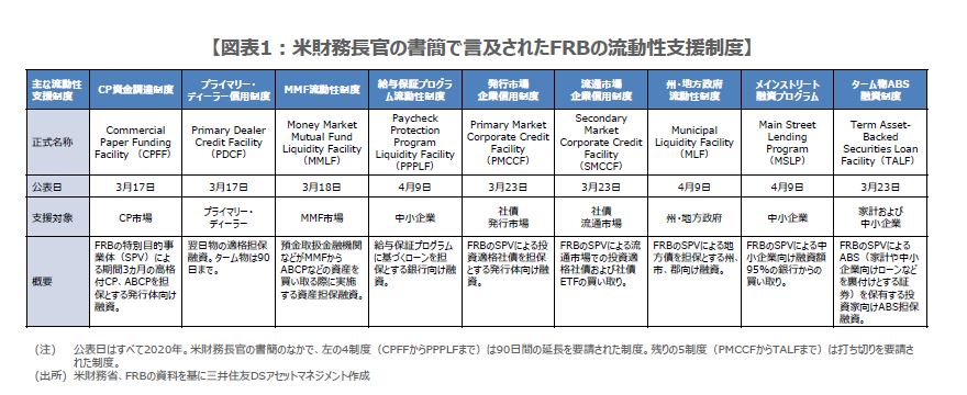 ムニューシン米財務長官は11月19日、米連邦準備制度理事会(FRB)のパウエル議長宛に書簡を送りました。内容は、「CP資金調達制度、Commercial Paper Funding Facility(CPFF)」など、4つの流動性支援制度について90日間の延長を求める一方、「発行市場企業信用制度、Primary Market Corporate Credit Facility(PMCCF)」など、5つの制度の打ち切りを要請するものです(図表1)。