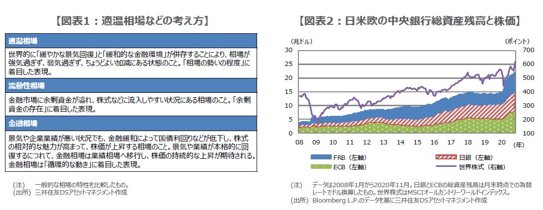 2021年は、多くの国々で景気に配慮した政策がしばらく継続され、また、時間の経過とともにワクチンが普及することで、経済活動がゆっくりと正常化に向かうことが想定されます。「緩和的な金融環境」のなか、「緩やかな景気回復」が実現した場合、両者の併存によって、相場は強気過ぎず、弱気過ぎず、ちょうどよい加減にある「適温相場」の状態となります(図表1)。