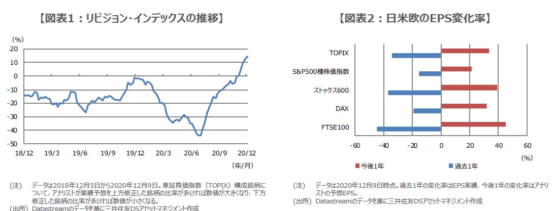 ただ、東証株価指数(TOPIX)に関し、アナリストによる業績予想の傾向を示す「リビジョン・インデックス」に目を向けると、足元では+14.7%と、業績予想を上方修正した銘柄の比率が大きくなっています(図表1)。また、今後1年で、予想1株当たり利益(EPS、Earnings Per Share)は+33.6%の伸びが見込まれていることから(図表2)、企業業績はすでに底を打ち、この先、大きく回復するとの見方が市場に織り込まれていると解釈できます。