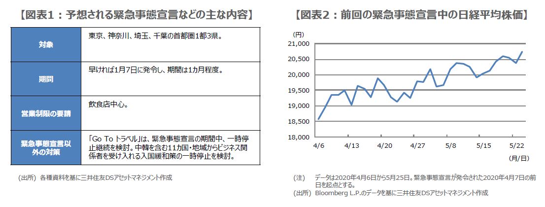 菅義偉首相は1月4日、年頭の記者会見で、新型コロナウイルスの感染再拡大を抑制するため、「緊急事態宣言」の再発令を検討すると述べました。対象は東京、神奈川、埼玉、千葉の首都圏1都3県とし、期間は1カ月程度を想定しているとみられます。菅首相は会見で、飲食の場における感染防止が重要との考えを明らかにしており、詳細が決まり次第、早ければ7日にも発令される見通しとなっています(図表1)。