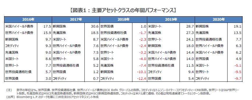 一方、リートは、ホテル、ショッピングセンター、オフィスなどの回復が遅れ、コモディティは原油安が重しとなり、それぞれ年間でマイナスとなりました。2021年を展望した場合、世界的に低金利環境が続き、景気が緩やかに持ち直すという条件の下では、引き続き配当収入(インカムゲイン)より資産価格の値上がり益(キャピタルゲイン)が重視されやすく、リートとコモディティの本格回復にも、まだ少し時間がかかると思われます。