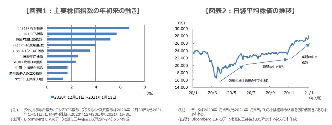 日経平均株価は、2020年12月29日に27,000円台を回復し(終値ベース、以下同じ)、そのわずか6営業日後の2021年1月8日に28,000円台を回復しました。年初からの上昇率は1月8日までで2.5%となっており、まずは好スタートを切ったといえます。弊社は今年の日本株について、上値を試す展開を予想していますので、ここまでの動きは、やや上昇ペースが速いものの、想定の範囲内とみています。