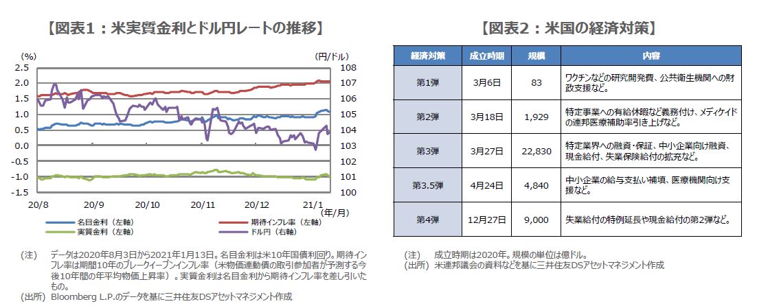 このような動きを踏まえると、バイデン次期政権の財政政策は、今後の米10年国債利回りとドル円を見通す上で、極めて重要な要素になると思われます。これまで実施されてきた米経済対策は図表2の通りです。バイデン氏は1月8日、個人への直接給付金増額を含む、数兆ドル規模の追加経済対策が直ちに必要と述べており、市場では経済対策の規模と成立時期への関心が高まっています。