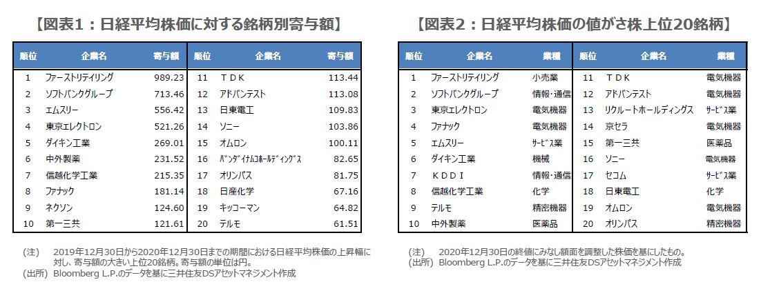2020年通年で値がさ株の変動が日経平均株価の変動にどの程度寄与したかについて確認する