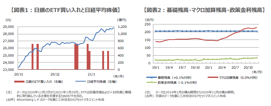日銀は、リスクプレミアムへの働きかけを適切に行う観点から、資産の買い入れを行っています。ただ、最近では、日経平均株価が終値で28,000円台を回復するなど、株高基調が続く年明け以降もETFの買い入れが続いています(図表1)。金額の縛りがなくなれば、株高局面でETFの買い入れを抑制し、株安局面で拡大できるため、政策の持続性、機動的な対応、という観点からも、設定金額の撤廃は合理的といえます。