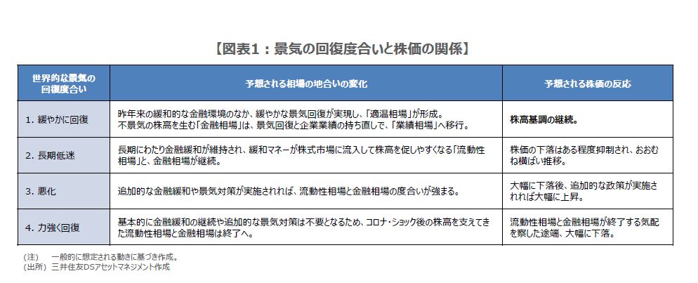 リスクシナリオとして警戒すべきは、景気が力強く回復した場合、すなわち④のケースです。この場合、基本的に金融緩和の継続や追加的な景気対策は不要となるため、コロナ・ショック後の株高を支えてきた流動性相場と金融相場は終わりを迎えます。株式市場は、その気配を察した途端、株安で反応する恐れがあります。これを回避するため、特に金融当局には、回復の力強さがうかがえる比較的早い段階での慎重な政策の舵取りが求められます。