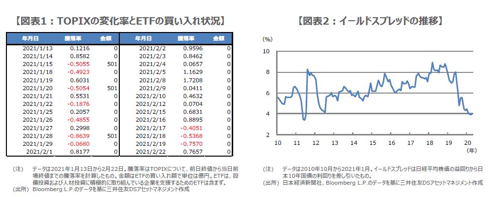 なお、日銀は現在、金融緩和の点検を行っており、その結果を3月18日、19日の金融政策決定会合で公表する見通しです。現在、ETFの買い入れは目標金額(年間約12兆円相当の残高増加ペースが上限)が設定されていますが、リスクプレミアムが縮小するなか、柔軟な買い入れ方針が示される限り、3月の会合で目標金額が撤廃されても、市場に動揺が広がる恐れは小さく、また、足元の0.5%ルールに従わない行動は、事前の打診とも受け取れます。