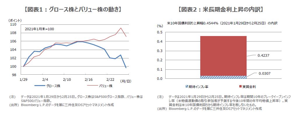 また、長期金利が上昇すると、ハイテクなどのグロース株が売られやすくなります。これは、グロース株は一般に、株価を1株あたり利益で割った株価収益率(PER)が高く、PERの逆数である益回りが低い傾向にあるため、長期金利の上昇局面では、相対的な益回りの低さが嫌気されるためです。実際、米長期金利の上昇ペースが加速した2月以降、グロース株と、一般にPERの低い(益回りの高い)バリュー株の動きは対照的です(図表1)。