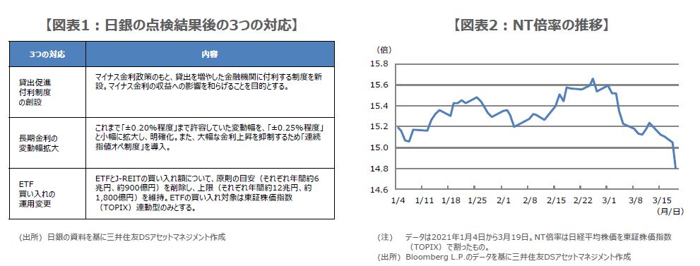 日銀は3月19日、より効果的で持続的な金融緩和を実施していくための点検結果を公表しました。具体的に政策面では3つの対応が示され(図表1)、1つ目は、将来のマイナス金利の深掘りを可能にするため、「貸出促進付利制度」を創設することが明らかになりました。これは、マイナス金利政策のもと、貸出を増やした金融機関に付利する制度で、マイナス金利の収益への影響を和らげることを目的とするものです。