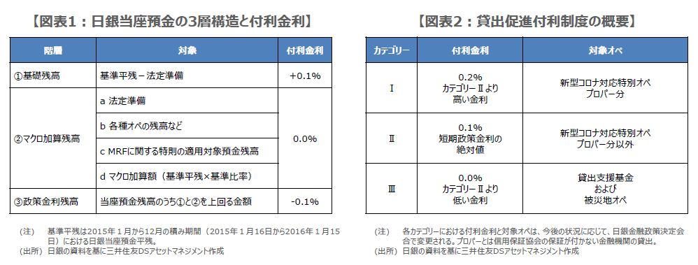 3月に公表された、①の貸出促進付利制度も、貸出がマイナス金利の影響を受けないよう工夫された制度です。具体的には、日銀が貸出促進のために実施している資金供給オペの残高に応じて金利を付利するというものです(図表2)。これにより、例えばマイナス金利をマイナス0.1%からマイナス0.2%に深掘りした場合、カテゴリーⅡにはプラス0.2%、カテゴリーⅠにはそれより高い金利をそれぞれ付利し、深掘りの影響を緩和します。