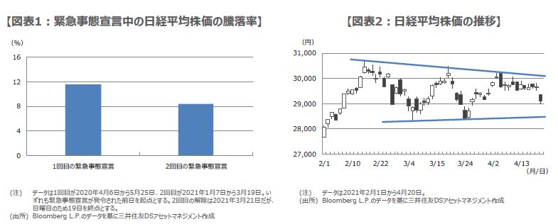 そこで以下、過去2回の緊急事態宣言と株価の関係を確認してみます。日経平均株価は、1回目の緊急事態宣言中(2020年4月7日~5月25日)に11.7%上昇し、2回目の緊急事態宣言中(2021年1月8日~3月21日)に8.4%上昇しました(図表1)。つまり、緊急事態宣言が発令されると、市場は直ちに、それによる感染者数の減少と、宣言解除後の経済活動再開を織り込み、株高で反応する傾向がうかがえます。