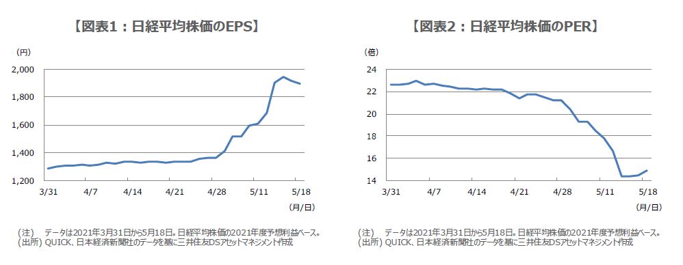 日経平均株価のEPSとPERについて、3月31日から5月18日までの推移を示したものが図表1と図表2です。ここで、図表1のEPSの動きに注目してみると、足元で水準が大幅に切り上がっていることが分かります。これは、直近の決算発表を経て、EPSが今期の1株あたり利益について、20%程度の増益を織り込んだことによるものと推測されます。これ自体、株価にとっては好材料です。