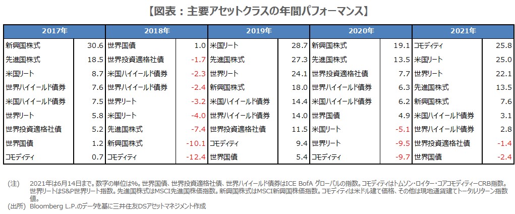 2021年の6月14日までのパフォーマンスは図表の通りです。上昇率の第1位はコモディティの25.8%、第2位は米国リートの25.0%、世界リートの22.1%となっており、2020年は通年でマイナス圏に沈んだこれらのアセットクラスが、一気に巻き返す格好になっています。これは、年明け以降、世界的に新型コロナウイルスのワクチンの接種が普及し、経済活動の正常化と一段の景気回復に対する期待が市場に広がったためと推測されます。
