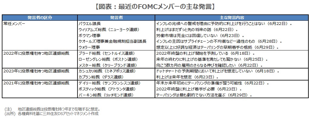 そして、再来年のFOMCで投票権を持つ地区連銀(シカゴ、フィラデルフィア、ダラス、ミネアポリス)の総裁発言をみると、ミネアポリス連銀のカシュカリ総裁は2023年もゼロ金利維持の姿勢ですが、ダラス連銀のカプラン総裁は2022年に最初の利上げを予想しています。また、フィラデルフィア連銀のハーカー総裁は、6月のFOMC以前から、テーパリングに関する議論を早めに始めるべきだとの見解を示していました。