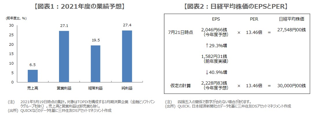 なお、日経平均株価について、今年度の予想1株あたり利益(EPS)と株価収益率(PER)は、7月21日時点で、それぞれ2,046円66銭、13.46倍でした。今年度の予想EPSは、前年度から29.3%増の水準ですので、仮にこれが40.9%増となり、PERが13.46倍のままであれば、日経平均株価は30,000円を回復します(図表2)。40.9%増という水準は、それほど遠い訳でありませんが、ここまでの上方修正には、まだ時間がかかると思われます。
