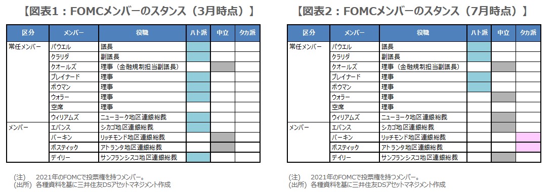 まず、毎年投票権を持つ常任メンバーでは、パウエル議長をはじめ、ほとんどのメンバーがスタンスを変えていないと思われます(図表2)。ただ、ウォラー理事は最近、量的緩和の縮小(テーパリング)について早期実施の可能性を示唆しており、ハト派から中立にスタンスが変化したとみられます。なお、クオールズ理事兼金融規制担当副議長の任期は10月13日となっており、退任の場合は、後任のスタンスが注目されます。
