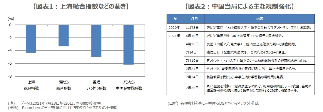 先週は中国株が大幅安となり、上海総合指数は4.3%下落、深セン総合指数は3.3%下落しました(図表1)。また、香港市場では、ハンセン指数が5.0%下落したほか、香港市場上場の中国大型株で構成するハンセン中国企業株指数は6.2%下落しました。中国当局はこのところ、IT(情報技術)プラットフォーム企業や教育産業に対する規制を相次いで強化しており、これが投資家の警戒感を強め、株安につながったと推測されます。