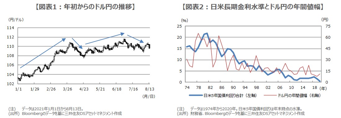 しかしながら、足元では再び109円台に戻ってきており、一本調子でドル高・円安が進行するまでには至っていません。実際、年明け以降のドル円は、2~3カ月程度ドル高・円安に振れた後、1カ月程度調整するというパターンが続いています(図表1)。この結果、ドル円の値幅は今年も相対的に小幅にとどまっており、8月13日時点で9円程度となっています。