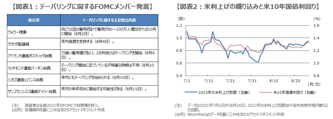 なお、すでに複数の米連邦公開市場委員会(FOMC)メンバーからは、年内のテーパリング開始を支持する旨の発言がみられ(図表1)、また、8月18日に公表された7月のFOMC議事要旨では、大半のメンバーが「年内のテーパリング開始が適切になる」とみていることが判明しています。そのため、今回のパウエル議長の講演で、具体的な手掛かりが示されなくても、テーパリングの年内開始は市場にほぼ織り込み済みと思われます。