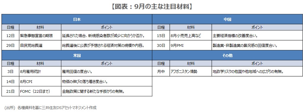 まず、国内では、引き続きコロナの感染動向に注意が必要です。緊急事態宣言は、9月12日の期限が延長される可能性が高まっていますが、延長された場合、新規感染者数が減少に向かうか否かがポイントです。また、9月29日投開票の自民党総裁選も注目材料ですが、誰が総裁となっても与党の政策方針は変わらないと思われるため、市場の関心は、総裁選後に公表が予想される経済対策にあるとみています。