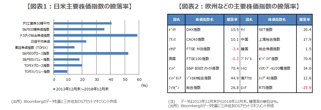 ここから、具体的に主要株価指数の騰落率をみていきます。米国では、2013年12月末から2018年12月末までの5年間において、ダウ工業平均株価指数は+40.7%、S&P500種株価指数は+35.6%、ナスダック総合株価指数は+58.9%と、大きく上昇しました(図表1)。日本でも、日経平均株価指数が+22.9%、東証株価指数(TOPIX)が+14.7%と、米国の3指数に比べ控えめな数字ではありますが、2ケタの上昇率となりました。