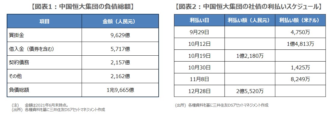 恒大の負債総額は、取引先への未払い分などを含めると、1兆9,665億元(約33兆4,000億円)に達するとみられ、これは中国の名目国内総生産(GDP)の約2%に相当する金額です(図表1)。今月下旬以降、社債の利払いが集中し、年内の利払い額は社債だけでかなりの金額にのぼる見通しです(図表2)。また、2022年からは利払いだけでなく満期償還を迎える予定です。