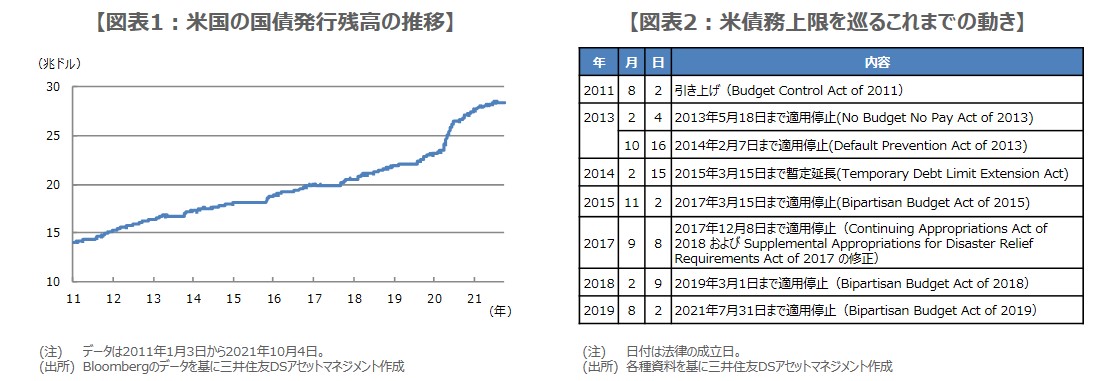 債務の法定上限は、2019年8月2日に成立した超党派予算法(Bipartisan Budget Act of 2019)で、2021年7月31日まで適用が停止されていましたが、翌8月1日から復活し、28兆5,000億ドルに設定されました。米国の国債発行残高は、すでに直近で約28兆4,289億ドルに達しているため(図表1)、米財務省は一部の公的年金基金への新たな資金拠出を制限するなどの特例措置を講じ、手元資金をやり繰りしています。
