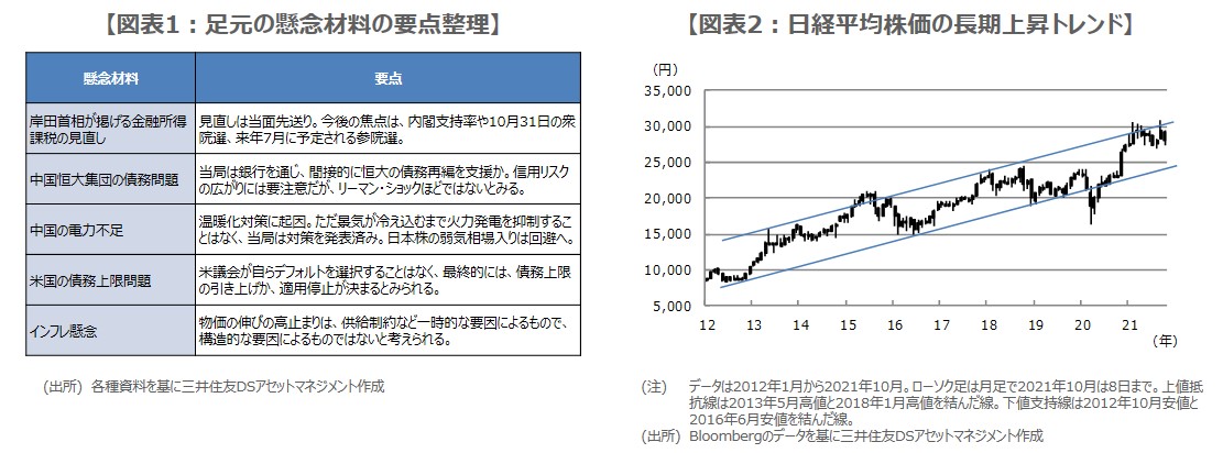まず、①について、岸田首相は10月10日、金融所得課税の見直しは当面考えていないと述べました。今後の焦点は、内閣支持率や10月31日の衆院選、来年7月に予定される参院選であり、長期政権が期待される結果となれば、日本株には好材料です。次に、②について、中国当局は銀行を通じ、間接的に恒大の債務再編を支援するとみています。信用リスクの広がりには要注意ですが、リーマン・ショックほどではないと考えます。