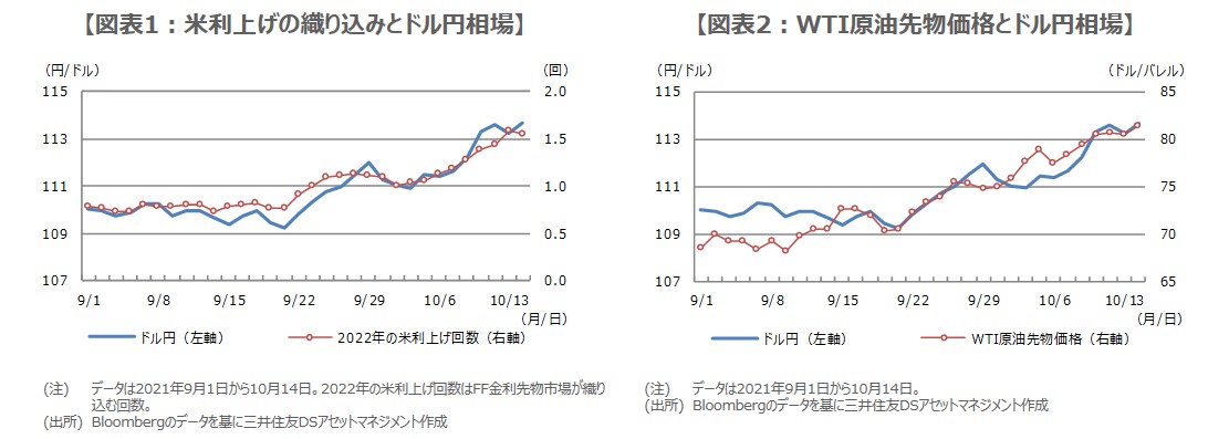 つまり、足元のドル高・円安の動きは、①9月のFOMCで、近くテーパリング開始の可能性が示唆され、同時に将来的な利上げ予想も示されたこと、②原油高がインフレを連想させたこと、この2点により、利上げの織り込みが一気に進んだことによるところが大きいと推測されます。実際、フェデラルファンド(FF)金利先物市場が織り込む2022年の米利上げ回数とドル円には、相応に高い連動性がみられます(図表1)。