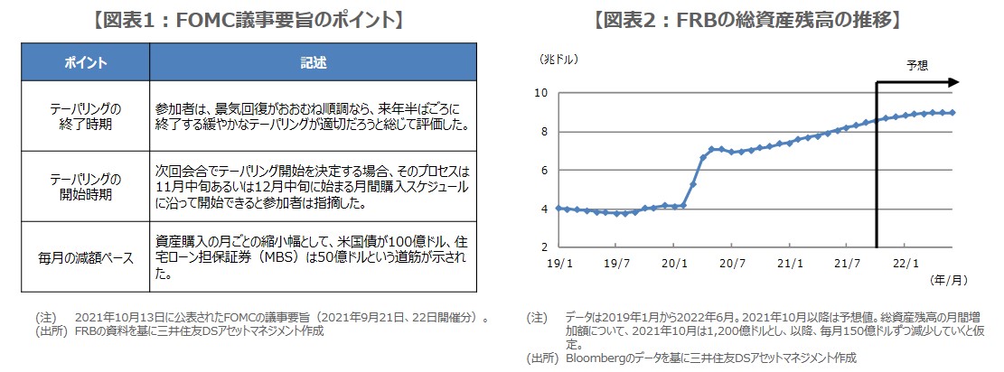 さらに今回の議事要旨では、テーパリングのスケジュールについて議論が進んでいることが明らかになりました(図表1)。具体的には、FOMC参加者は総じて、景気回復がおおむね順調なら、来年半ばごろに終了する緩やかなテーパリングが適切と評価しており、また、11月2日、3日に開催される次回のFOMCでテーパリング開始を決定する場合、11月中旬か12月中旬に開始できるとの見方が確認されました。