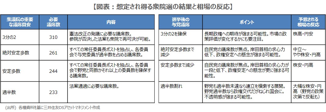 なお、衆議院解散時の議席数は、自民党276、立憲民主党110、公明党29、日本共産党12、日本維新の会10、国民民主党8などであり、自民、公明両党の議席数は305でした。選挙の結果、これらの議席数がどのように変化するかが注目されますが、今回のレポートでは、想定され得る選挙結果をいくつかのシナリオに分け、相場がどのように反応するかを考えてみます(図表)。