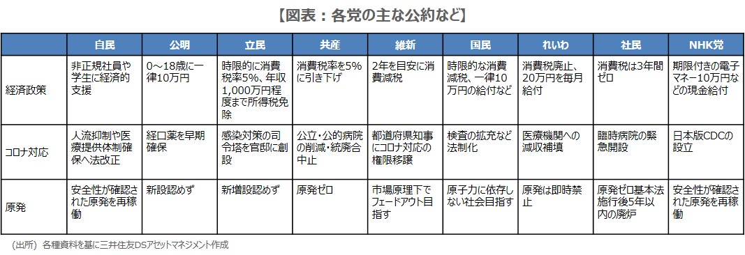 衆院選では、やはり自民党の議席数が注目点とみられますが、衆議院解散時は276議席でしたので、44議席以上減らすと単独過半数を失います。なお、主要政党の公約は図表の通りです。自民党の議席数次第では、長期政権への期待が高まり、政策との関連性から医療、介護、保育、教育、システム開発、ITサービス・コンサルティングなどの分野に改めて注目が集まる公算が大きいと思われます。
