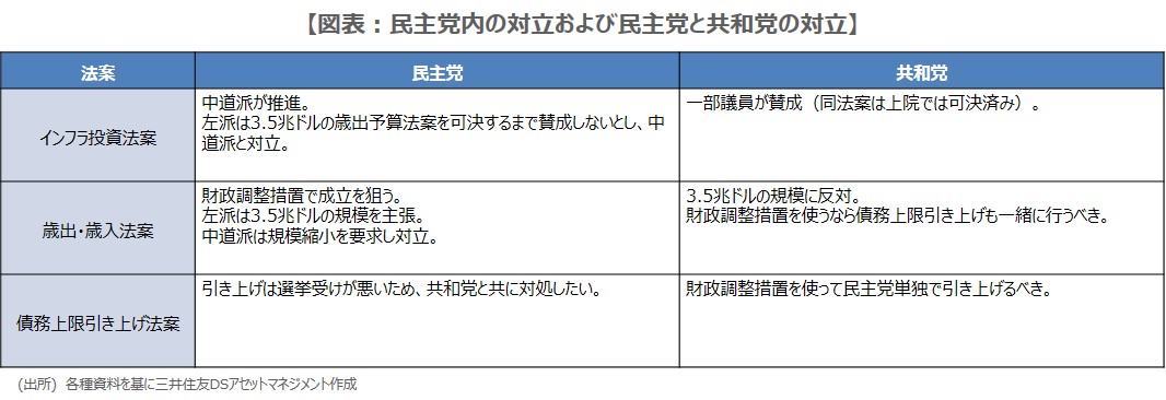 次に、新年度予算に関わる歳出・歳入法案について、民主党の左派は、予算決議の通り10年間で3兆5,000億ドル規模を強く主張していますが、中道派は規模の縮小を要求しており、こちらも民主党内で意見がまとまっていません。また、共和党も3兆5,000億ドル規模に反対しており、民主党が財政調整措置(現在、民主党は単独で予算関連法案の可決が可能)を使うなら、債務上限の引き上げも一緒に行うべきとの立場です。