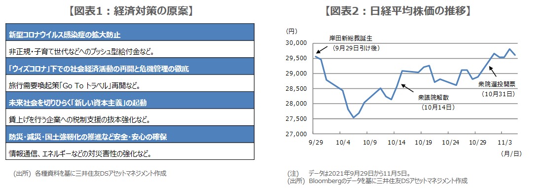 衆院選では与党が勝利しましたが、日経平均株価は依然30,000円台を回復しておらず(図表2)、岸田首相の経済対策について、海外投資家など市場の評価は、現時点であまり高くないと考えられます。評価を高めるには、中長期的に日本の経済や企業業績を展望した際、十分な成長と拡大が期待できるような、具体的で分かりやすい構造改革や規制緩和の提示が必要と思われます。