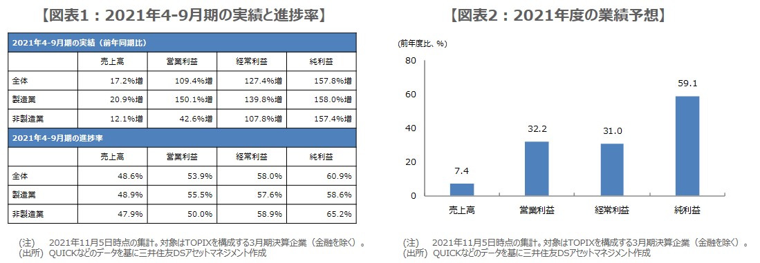 はじめに、2021年4-9月期の実績を確認すると、前年同期比で売上高は17.2%増、営業利益は109.4%増、経常利益は127.4%増、純利益は157.8%増となっています。4-6月期も大幅な増収増益でしたので、コロナの影響で業績が大きく落ち込んだ昨年の反動が、依然続いているとみられます。また、製造業、非製造業いずれも、順調な業績の回復傾向がうかがえます(図表1)。