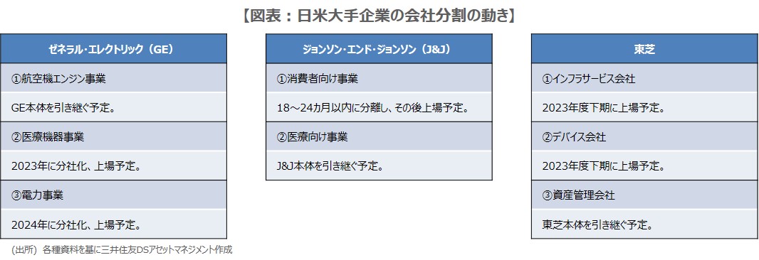 このところ、大手企業による会社分割の動きが続いています(図表)。米国ではゼネラル・エレクトリック(GE)が11月9日、会社を「航空機エンジン事業」、「医療機器事業」、「電力事業」に3分割することを発表しました。また、ジョンソン・エンド・ジョンソン(J&J)も11月12日、会社を日用品や市販薬を含む「消費者向け事業」と、処方薬や医療機器などの「医療向け事業」に2分割すると発表しました。