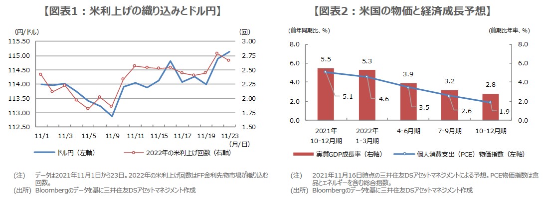 これを受け、同日のフェデラルファンド(FF)金利先物市場が織り込む2022年の米利上げ回数(0.25%の利上げ回数)は約2.8回となり、前営業日の約2.4回から増加しました(図表1)。米利上げの織り込みが進んだことで、米10年国債利回りは上昇、ドル円はドル高・円安で反応しました。ドル円については、翌23日もドル高・円安が進行し、1ドル=115円台をつけています。