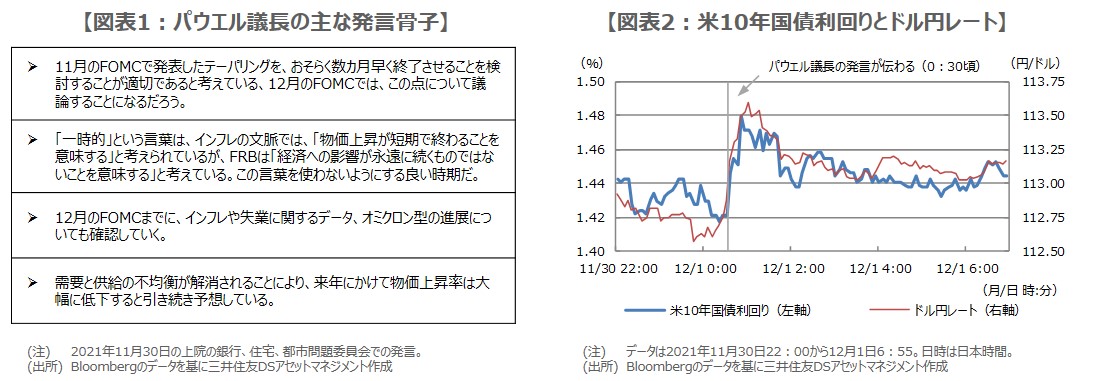米連邦準備制度理事会(FRB)のパウエル議長とイエレン米財務長官は11月30日、上院の銀行、住宅、都市問題委員会に出席し、「コロナウイルス支援、救済および経済安全保障法(通称、CARES法)」に関する証言を行いました。パウエル議長は今回、上院議員らの質問に答える形で、量的緩和の縮小(テーパリング)と物価について自身の見解を述べましたが(図表1)、市場はその内容をタカ派的と受け止めました。