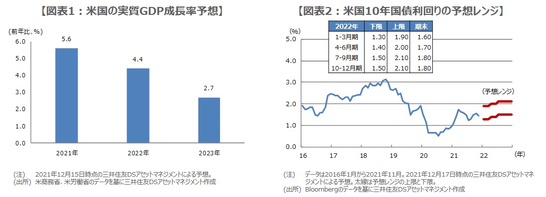 ただ、ワクチンの追加接種や治療薬の開発が進むことで、オミクロン型の感染拡大リスクは抑制されるとみています。また、足元では供給制約が徐々に緩和され始めていることもあり、2022年の米国経済は、通年でみれば底堅い推移が続くと思われます。なお、実質GDP成長率は、2021年が前年比+5.6%、2022年は同+4.4%、2023年は同+2.7%を想定しています(図表1)。
